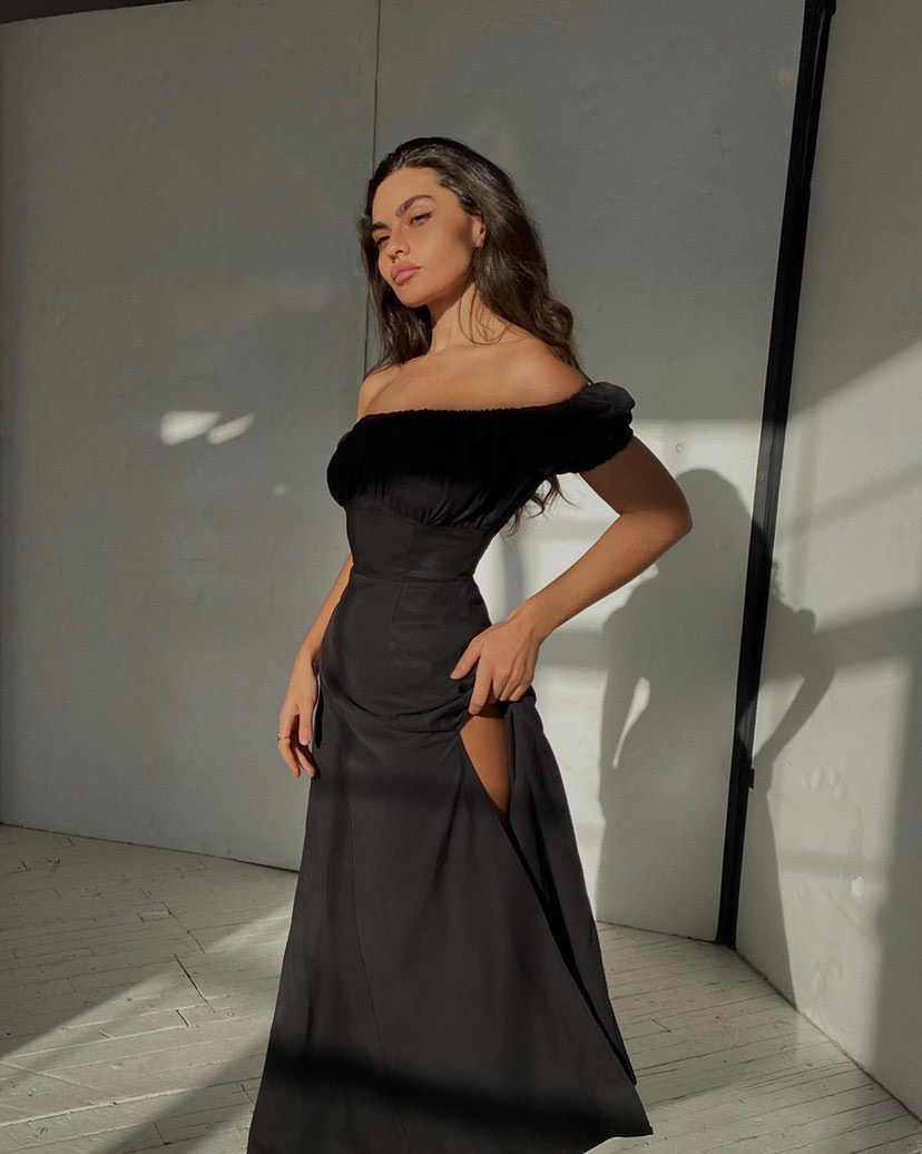 Corset dress maxi in black powder color. Open shoulders. A flirty slit slit on the leg. On the back there is a neat soft lacing that allows you to adjust the dress to your figure. Create the perfect feminine silhouette.
