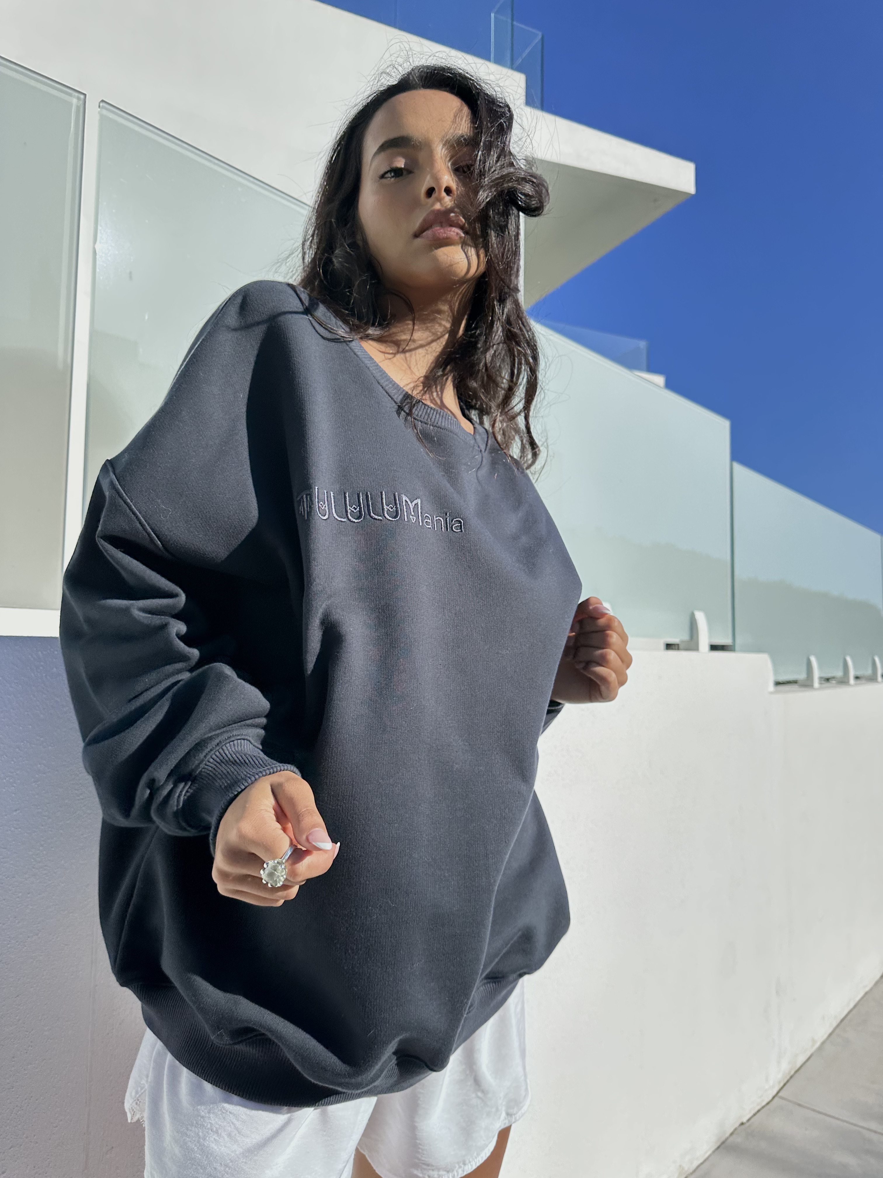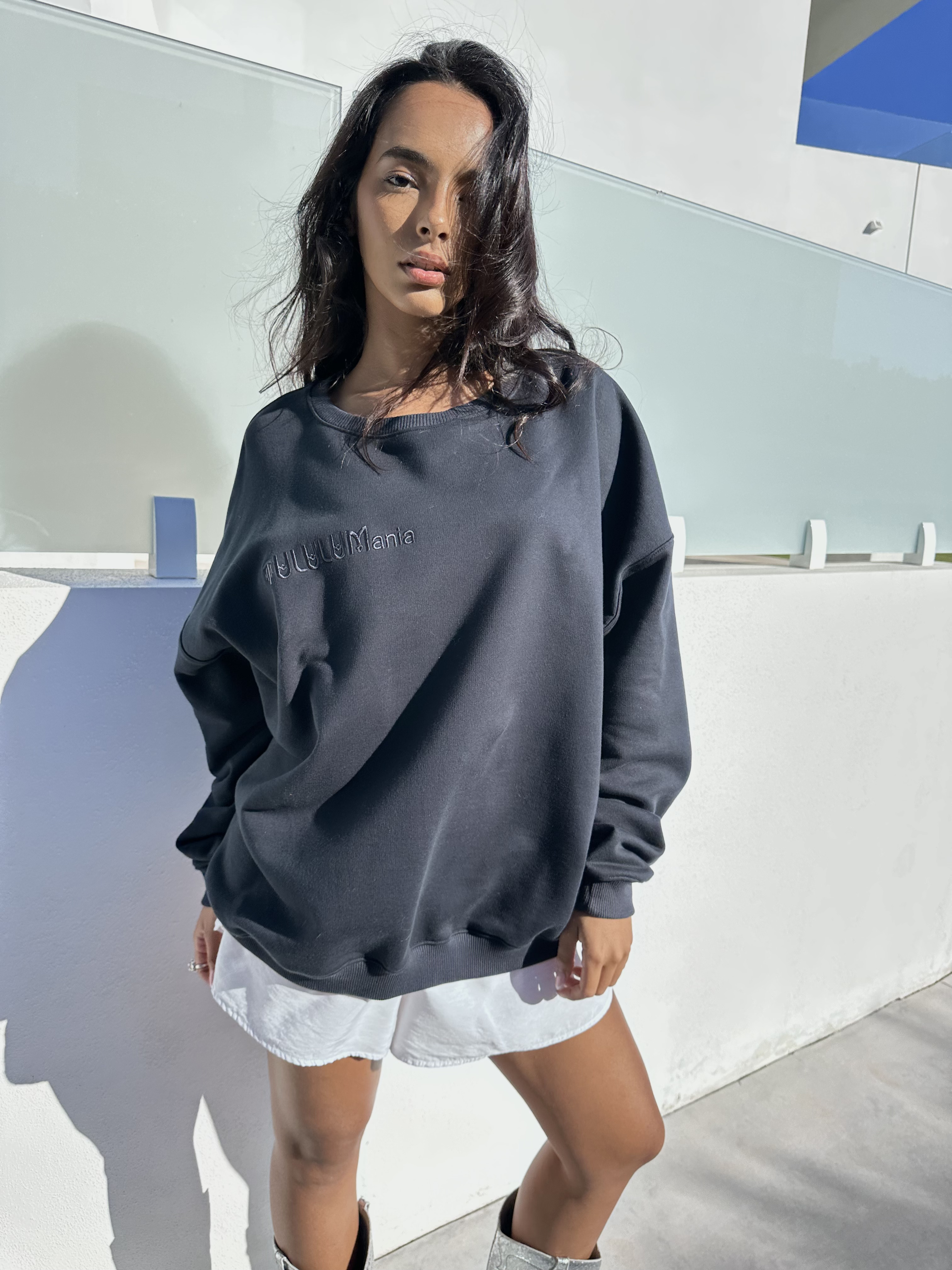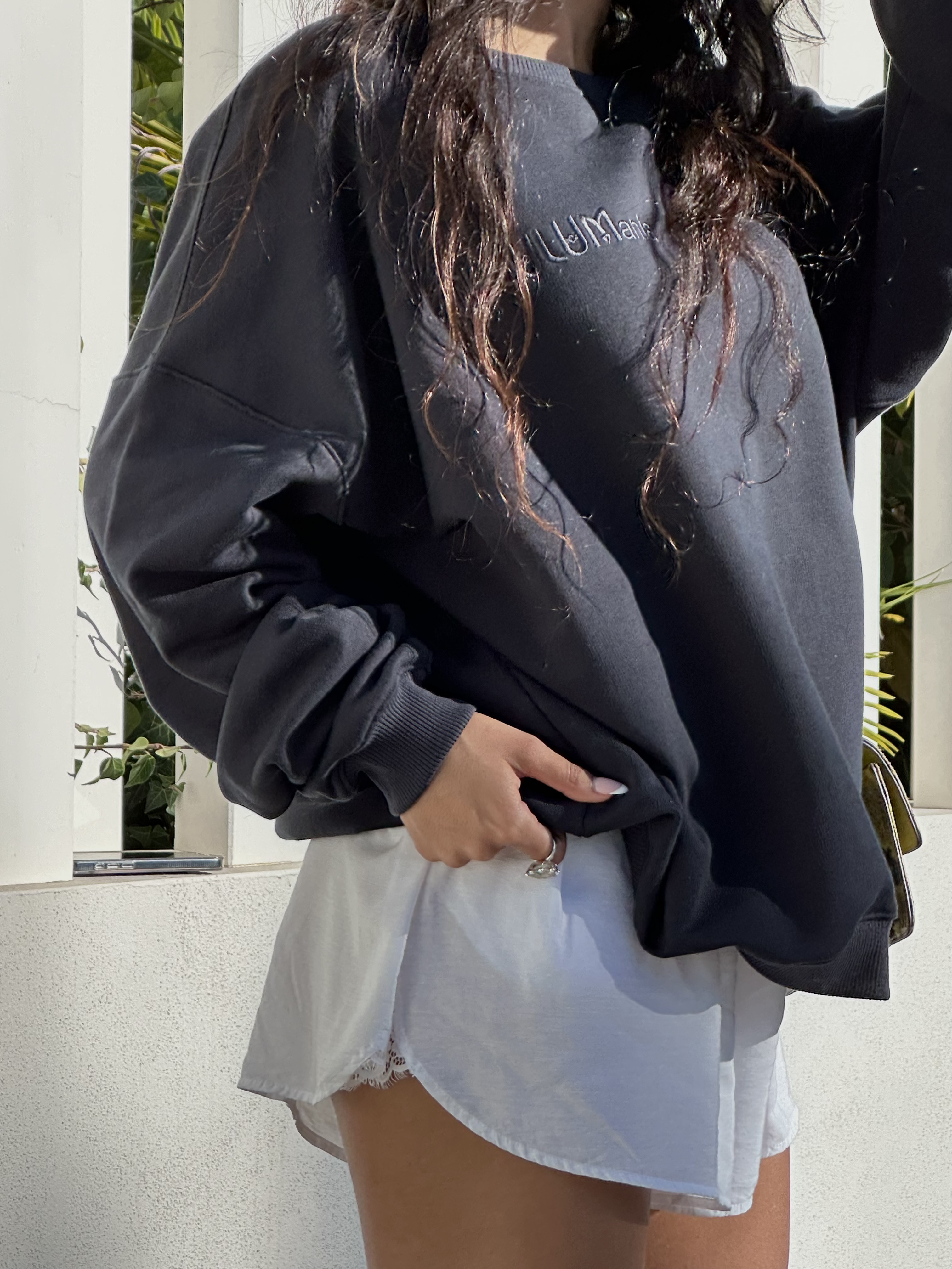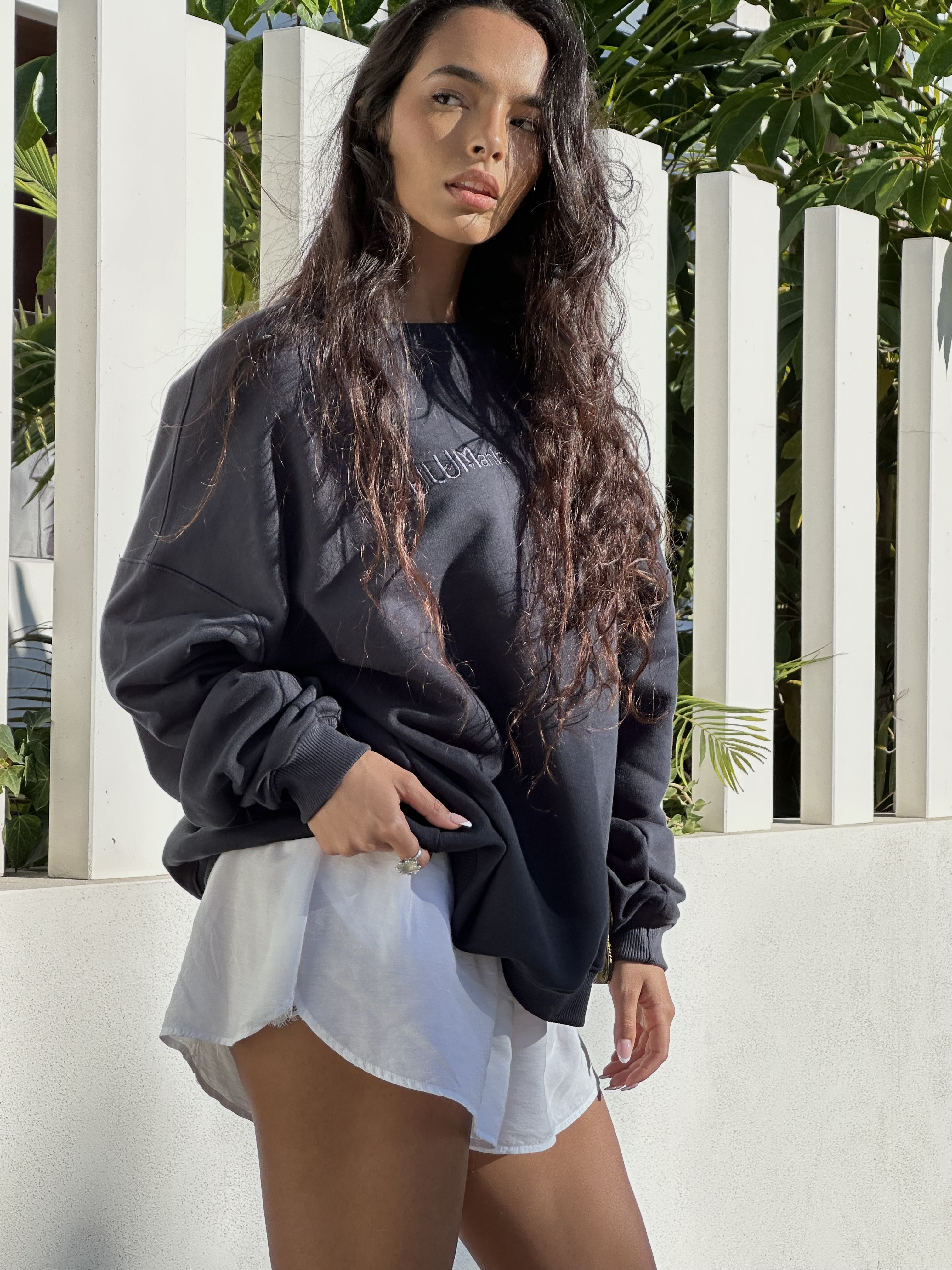 Sweatshirt oversize in graphite color. Made of soft organic cotton. Loose fit sleeves. Front kangaroo pocket.